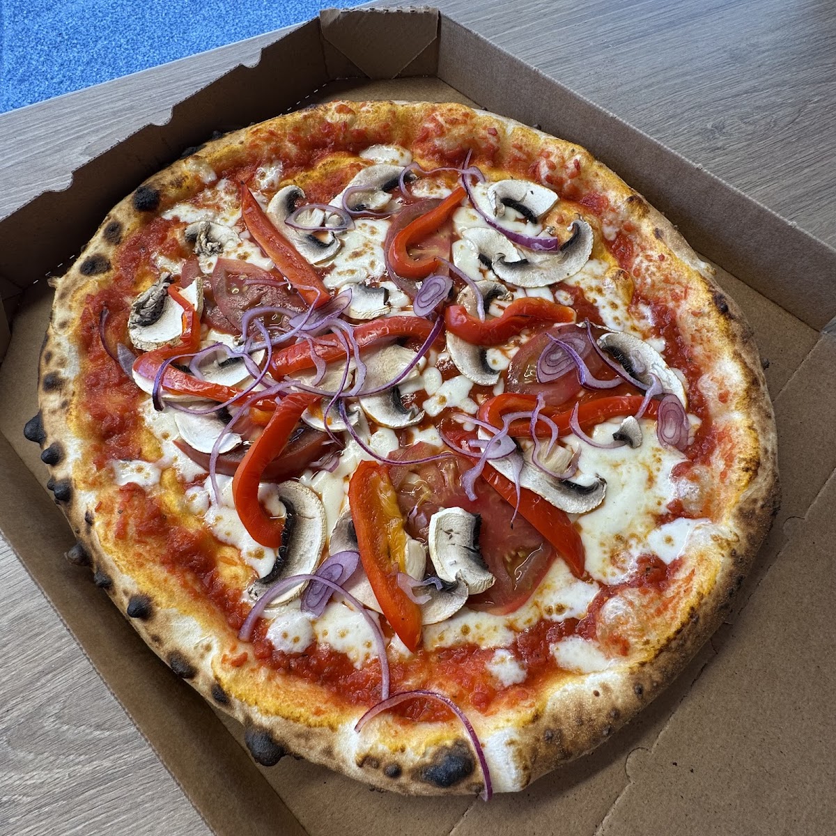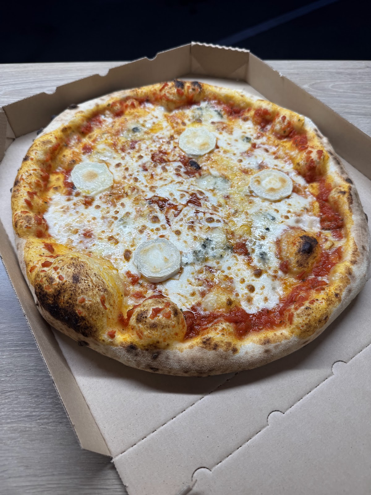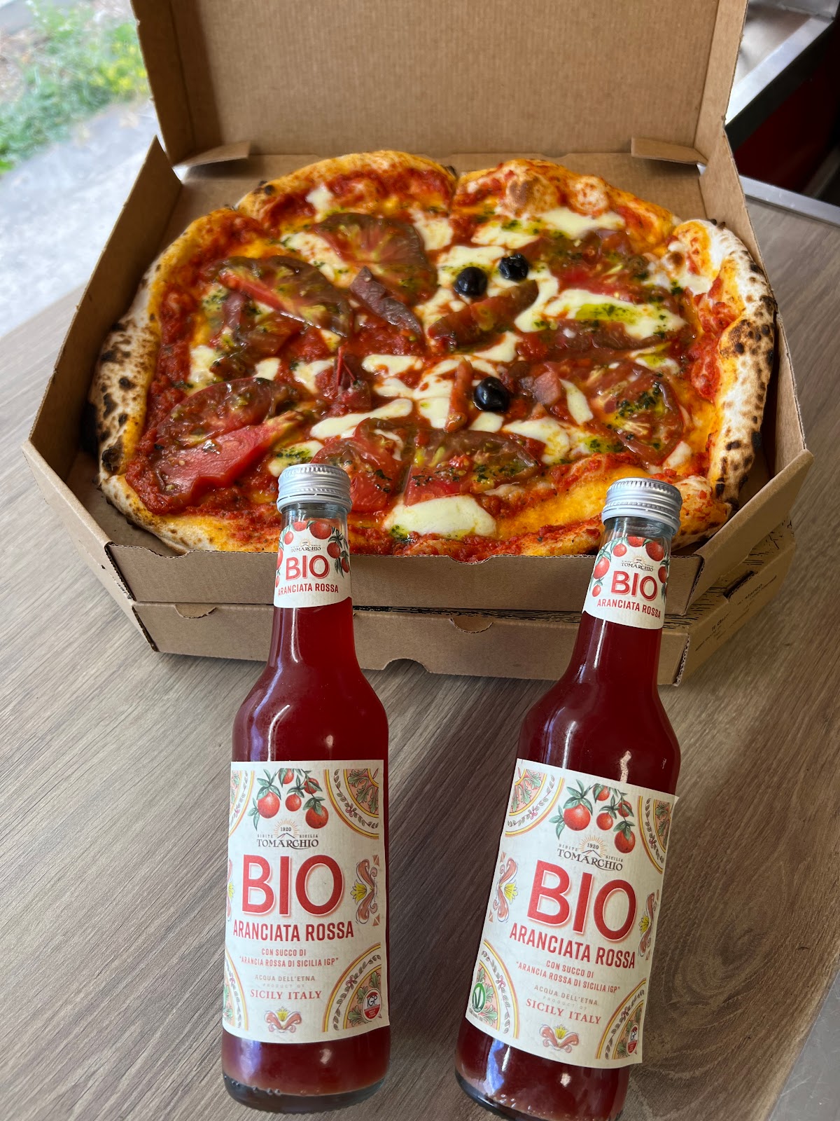Pizza incroyable ! Pâte moelleuse et bien cuite au feu de bois Vraiment excellente !! La sauce tomate est parfaite 🌟