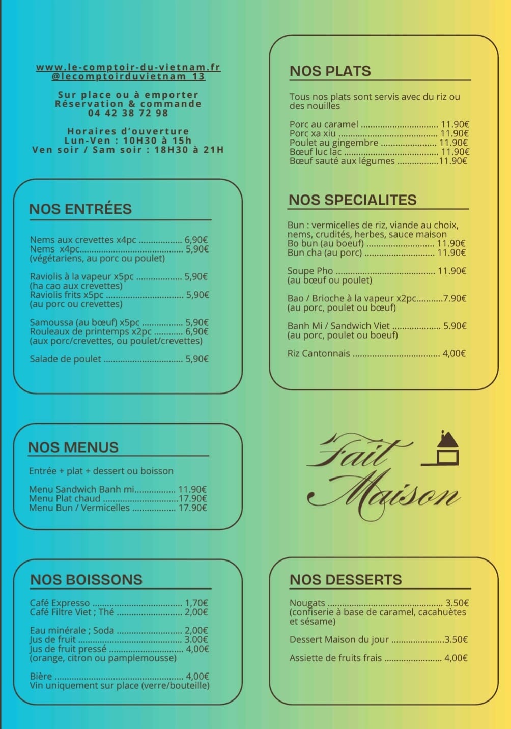 Une adresse qui a su conquérir les palais aixois. Dans ce quartier Aix-en-Provence où la concurrence est rude, Le Comptoir du Vietnam, Bouc Bel Air tire son épingle du jeu grâce à une offre d'exception de cuisine vietnamienne. L'établissement a su fidéliser une clientèle exigeante qui apprécie la constance et l'authenticité de ses propositions.